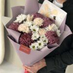 Букет из 5 малиновых хризантем сорта «Бигуди» и кустовых хризантем ромашек размера L